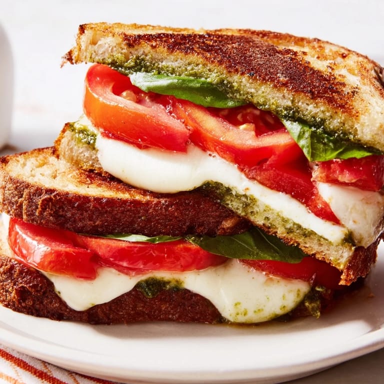 Save A vibrant twist on the classic grilled cheese, featuring melted mozzarella, ripe tomatoes, fresh basil pesto, and a crispy golden crust& perfect for a gourmet lunch or light dinner.