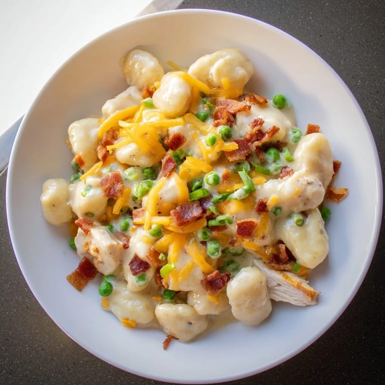 Save Experience the ultimate comfort food: pillowy potato gnocchi coated in a rich, creamy chicken sauce loaded with savory herbs, crispy bacon, and cheddar cheese for irresistible flavor.