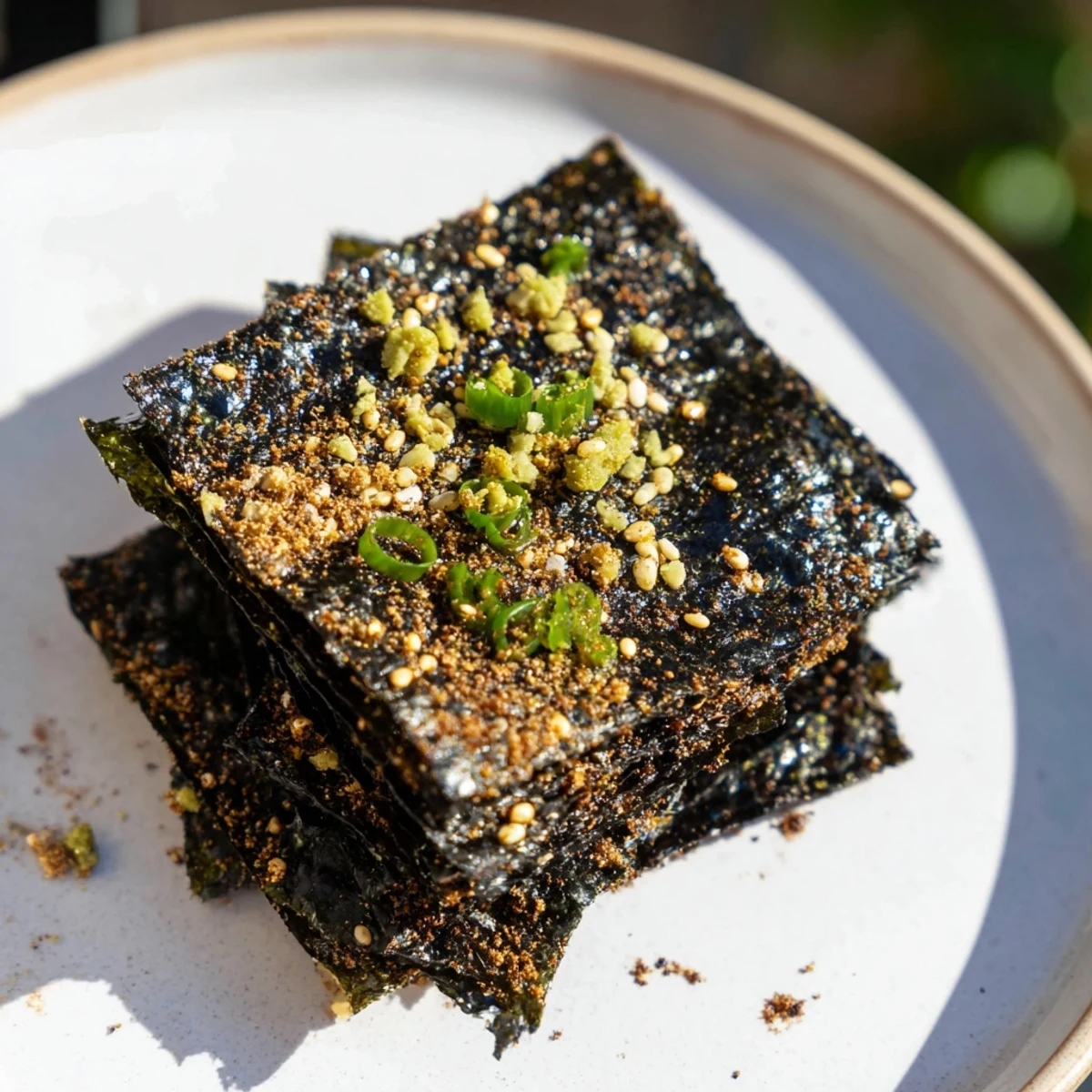 Roasted nori sheets are used for their crisp texture and rich umami flavor.