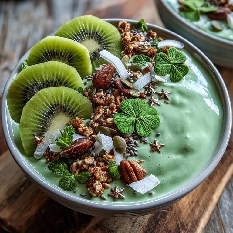 Smoothie bowls sit in this lovely space between breakfast and dessert, which is why they feel celebratory even on a random Tuesday. The kiwi shamrock is the detail that makes people slow down and actually look at their food instead of just scarfing it down, and that moment of noticing is half the magic. Serve it immediately so nothing gets soggy, and watch how people's faces light up when they see it.
