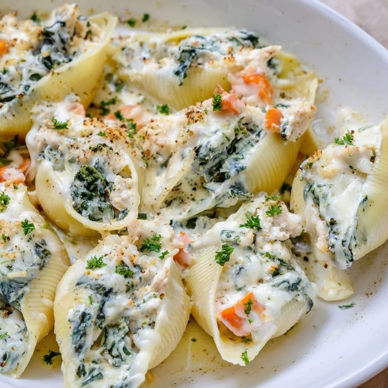Save A festive twist on classic stuffed shells featuring a creamy, protein-rich cottage cheese Alfredo sauce, spinach, and turkey, perfect for holiday gatherings.