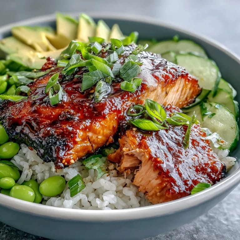 Save A vibrant and flavorful bowl featuring pan-fried salmon glazed with a sweet and spicy honey sriracha sauce, served over fluffy jasmine rice with crisp cucumber, edamame, creamy avocado, and a drizzle of sriracha mayo. This pescatarian-friendly dish is an Asian-inspired delight that balances heat and freshness in every bite.