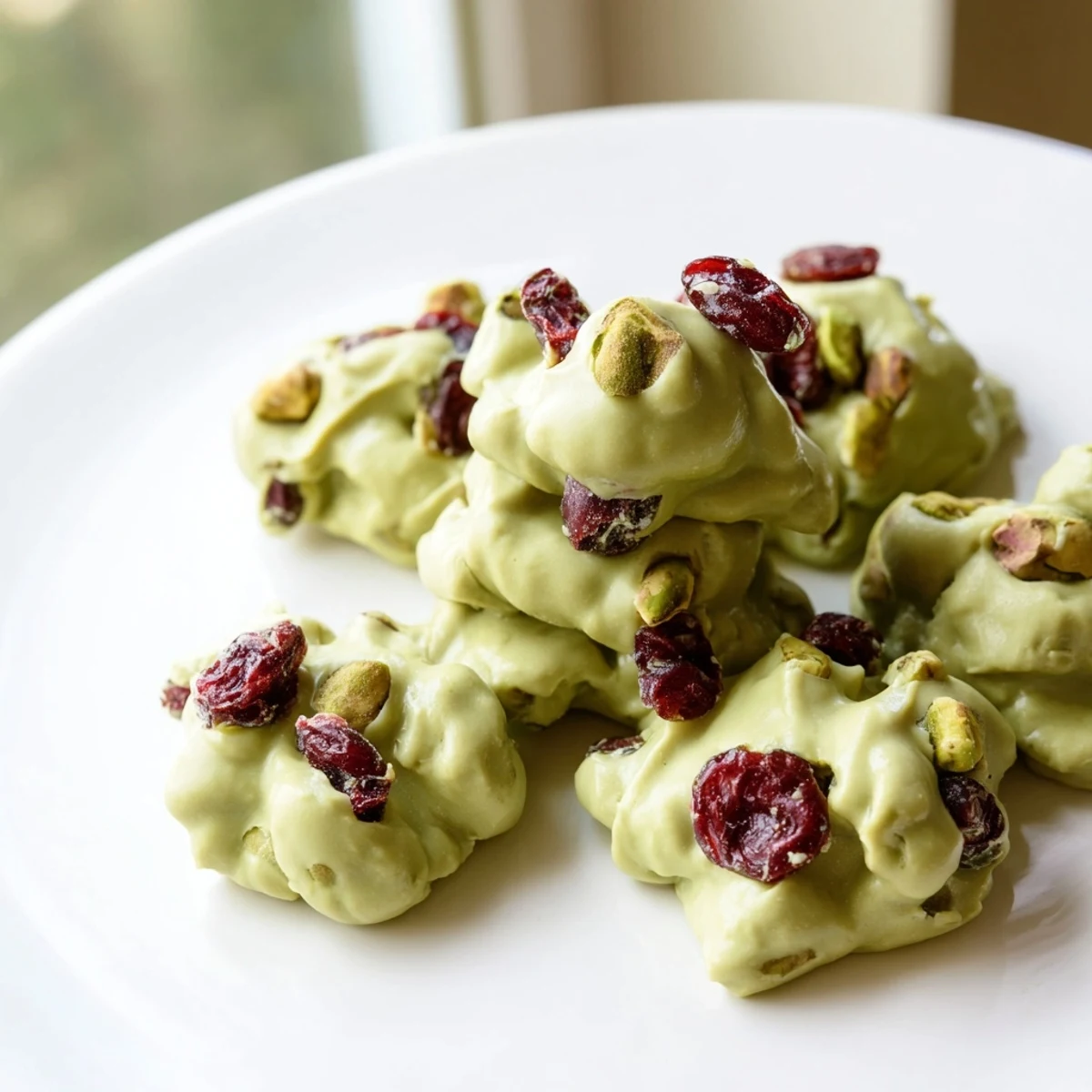 Save Delicate clusters of creamy white chocolate infused with earthy matcha and studded with tangy dried cranberries, perfect for a quick treat or elegant dessert.