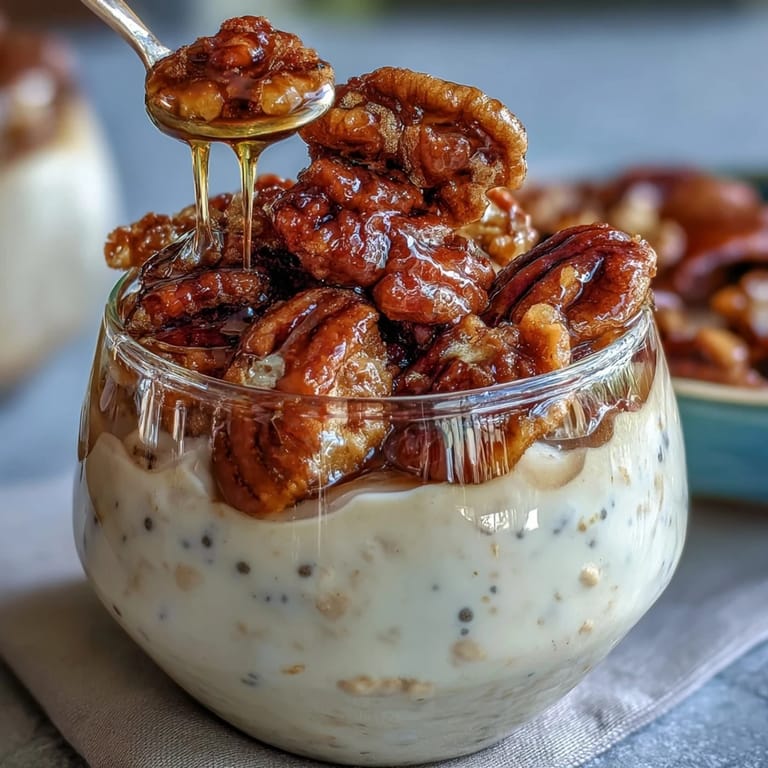 I made this for my roommate on her birthday, and watching her face when she bit into those candied pecans told me everything—she actually sat down at the kitchen table, no phone, just genuinely enjoying it. That's when I realized overnight oats aren't just convenient, they're the kind of thoughtful breakfast you'd make for someone you care about. It became our Sunday night ritual after that, prepping jars together while listening to music, turning something so simple into a moment we actually looked forward to.