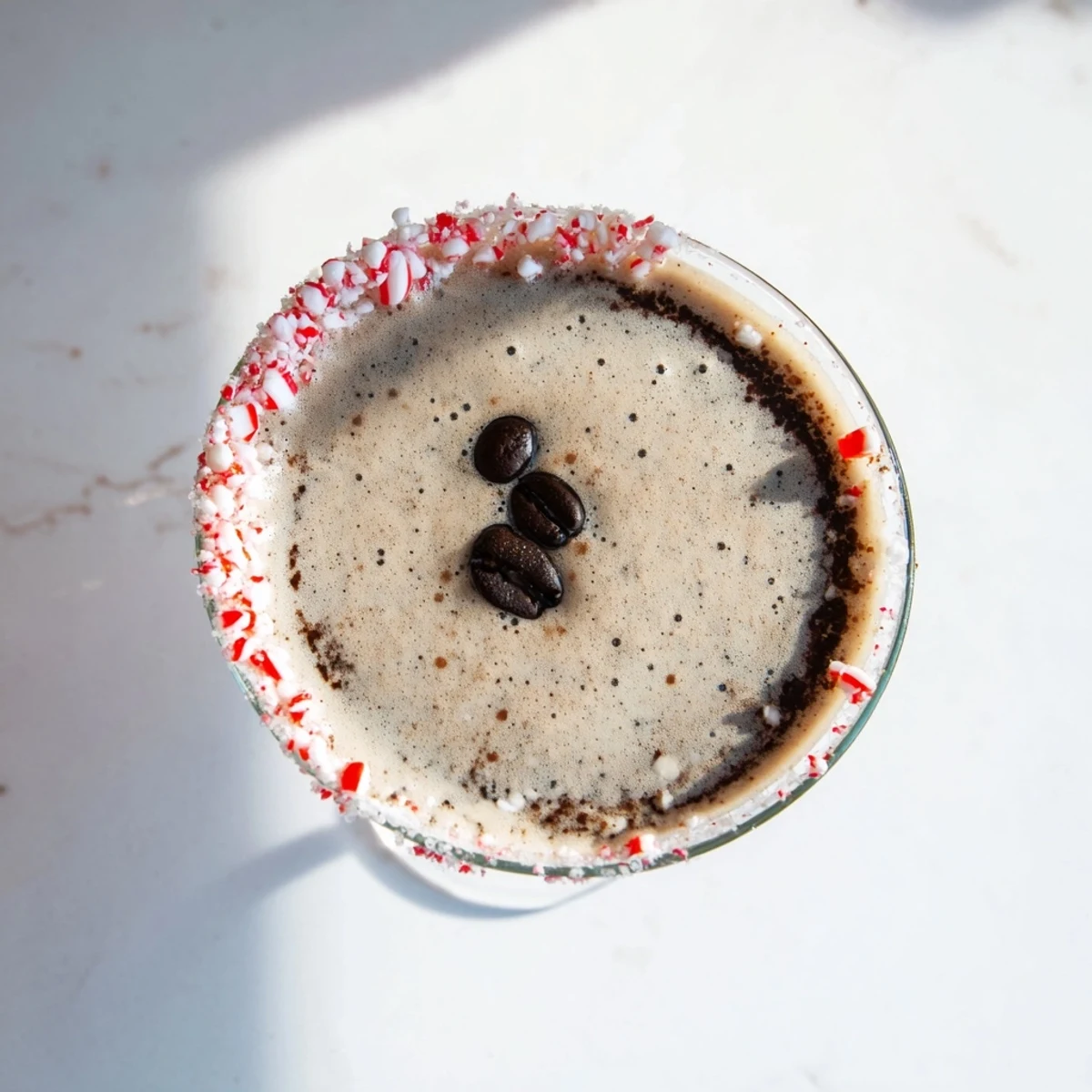 Garnish with three espresso beans on top and optionally a small candy cane stirrer for extra festive appeal.