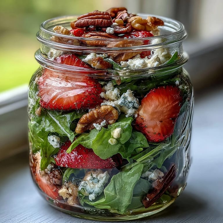 Save Last summer, my coworker Sarah showed up to our office potluck with these gorgeous jar salads, and I watched people actually fight over them—which never happens at work lunches. She explained that she'd started making them after a hiking trip went sideways when her regular salad turned into a soggy mess in her backpack. The layering trick keeps everything crisp until the moment you shake and eat, and the combination of sweet strawberries, tangy goat cheese, and toasted nuts just works on every single level. I've been making them ever since, mostly because they look so Instagram-worthy that my kids actually volunteer to eat their greens.