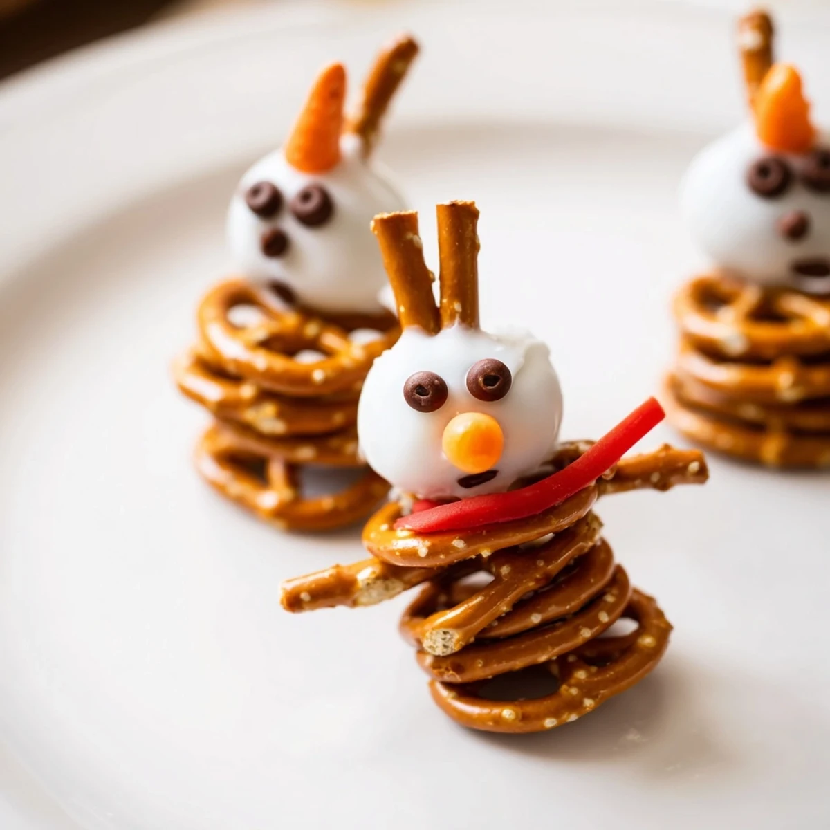Thread a mini pretzel rod through three pretzel rounds—one yogurt-coated for the head, two plain for the body. Use mini chocolate chips for eyes and buttons, add a carrot triangle nose, and wrap a red pepper slice as a scarf.